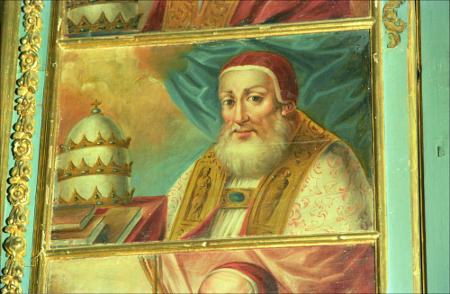Descripción : Camarín.- A la izquierda aparece una mesa con libros y la tíara papal. A la derecha aparece el Papa con traje blanco y dorado y gorro rojo.