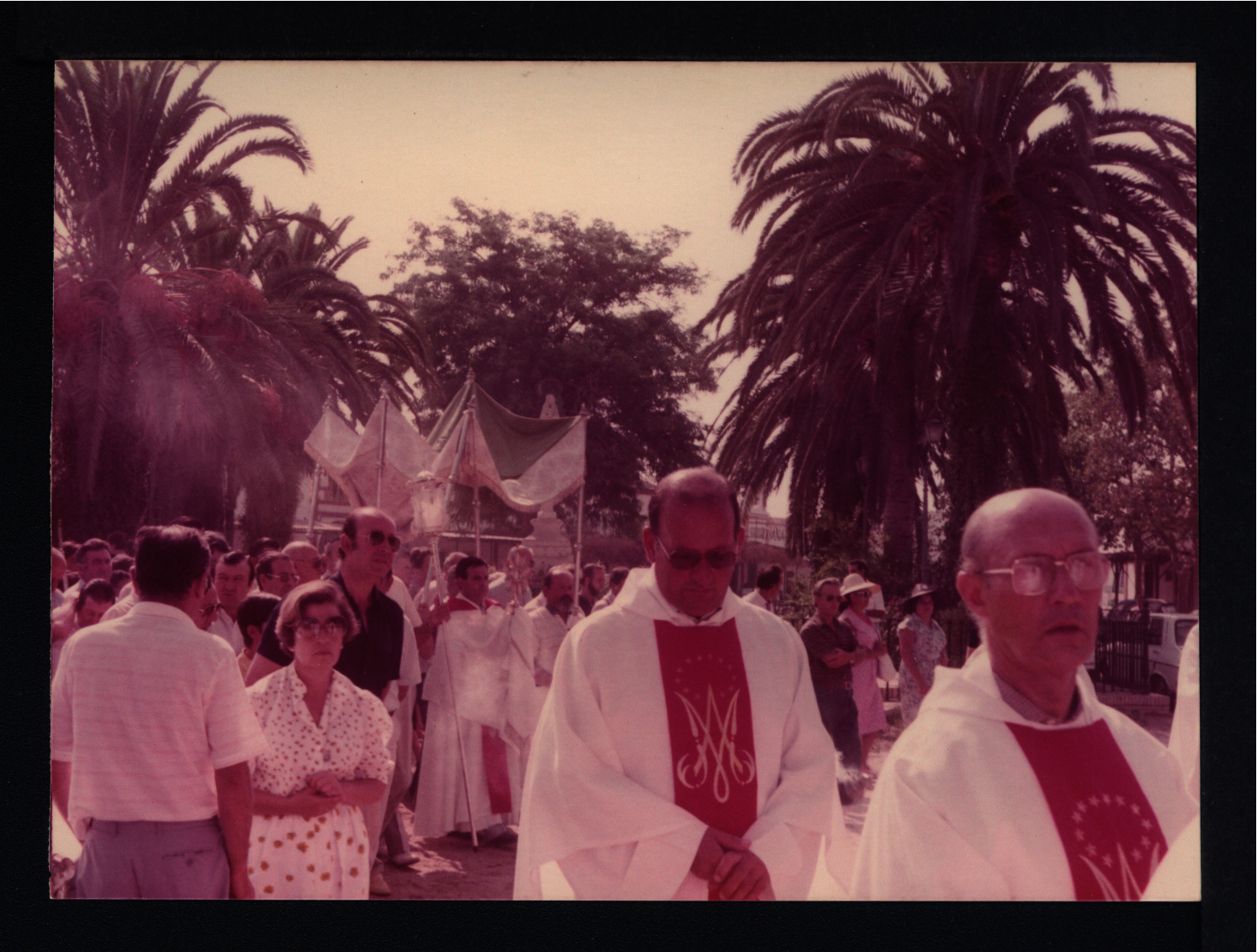 Procesión Eucarística alrededor del Santuario de la Virgen del Rocío, acompañada de una comitiva, en el Rocío Chico (Fotografía). Fondo Juan Infante Galán