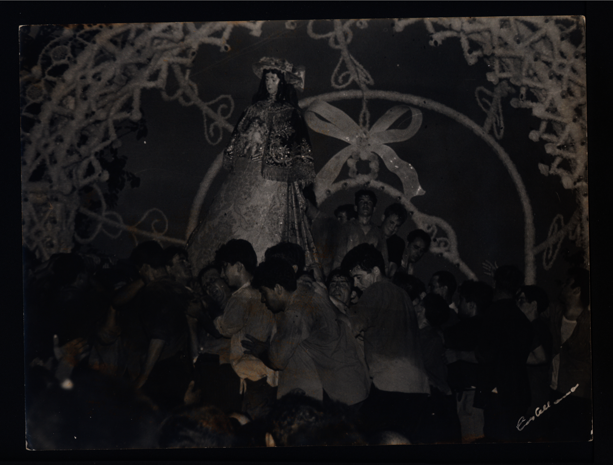 Título : Virgen del Rocío, vestida de pastora, a su llegada al Chaparral en el traslado de 1963 (Fotografía). Fondo Juan Infante Galán
