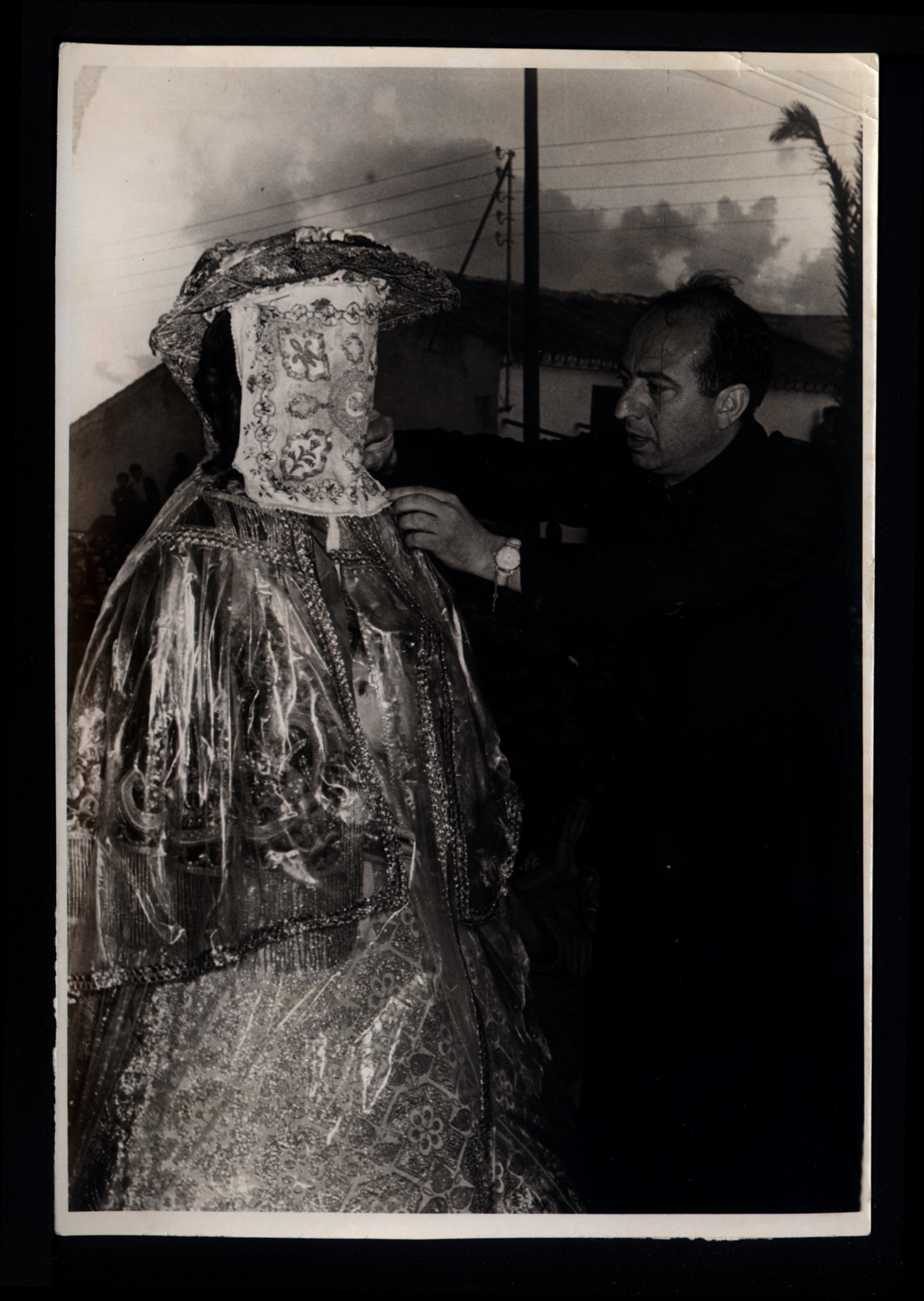 | Título : | El capellán de la Hermandad le quita el pañito y el capote a la Virgen del Rocío en el momento de llegar a la aldea en su traslado de 1971 (Fotografía). Fondo Juan Infante Galán |