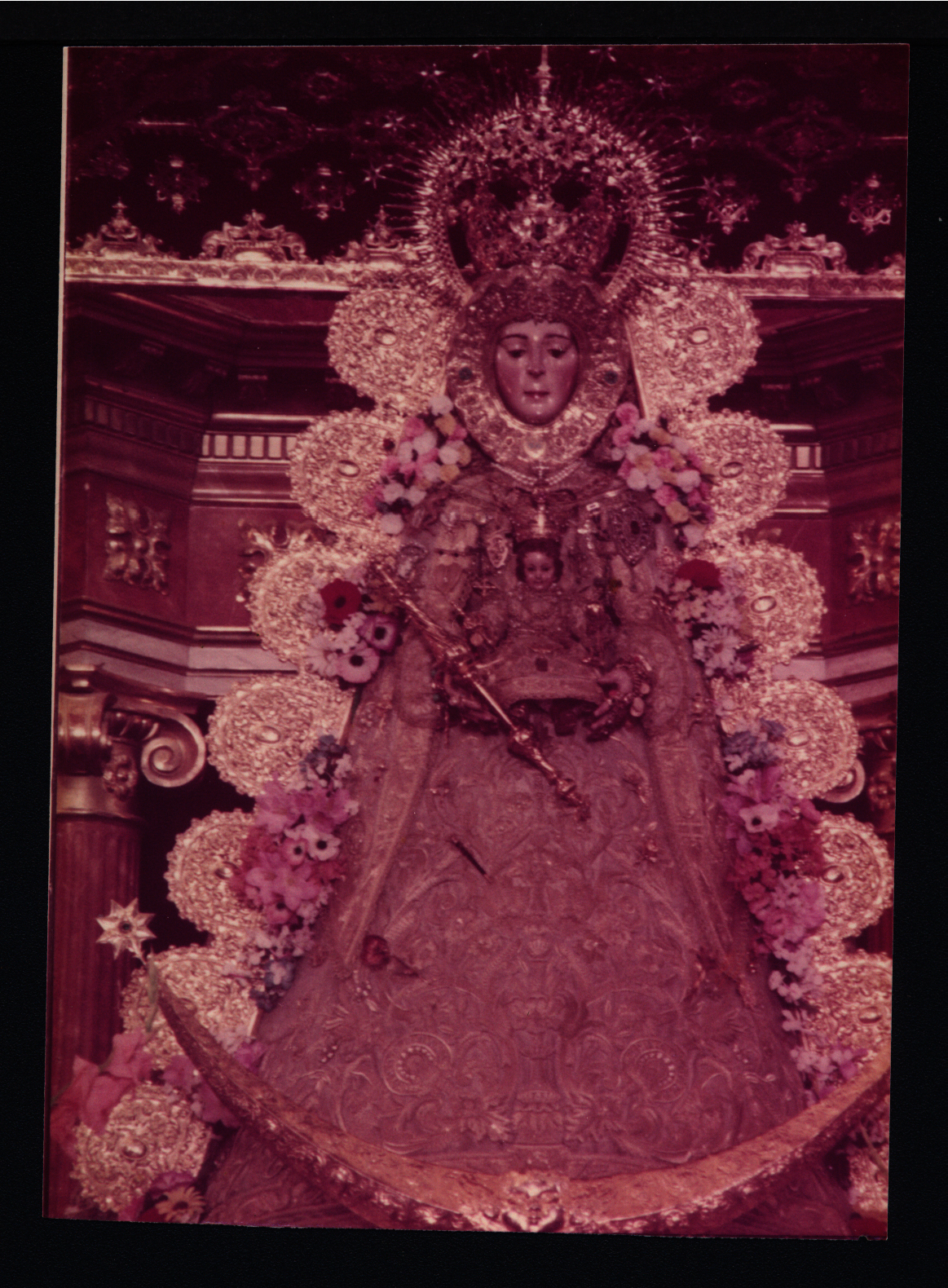 Virgen del Rocío, vestida de reina, con ráfagas de puntas redondas en el palio situado en el Altar Mayor de la parroquia de Nuestra Señora de la Asunción (Fotografía). Fondo Juan Infante Galán