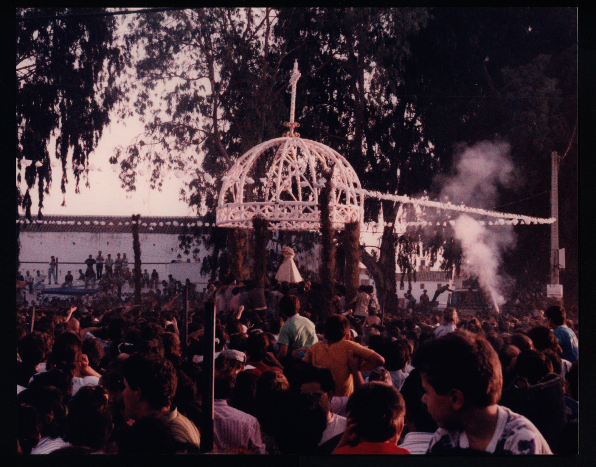 Título : Virgen del Rocío, vestida de pastora, y cubierta por su capote en el conocido Altar del Pañito para comenzar su camino hacia Almonte en el Traslado de 1991 (Fotografía). Fondo Hermandad de Nuestra Señora del Rocío de Almonte