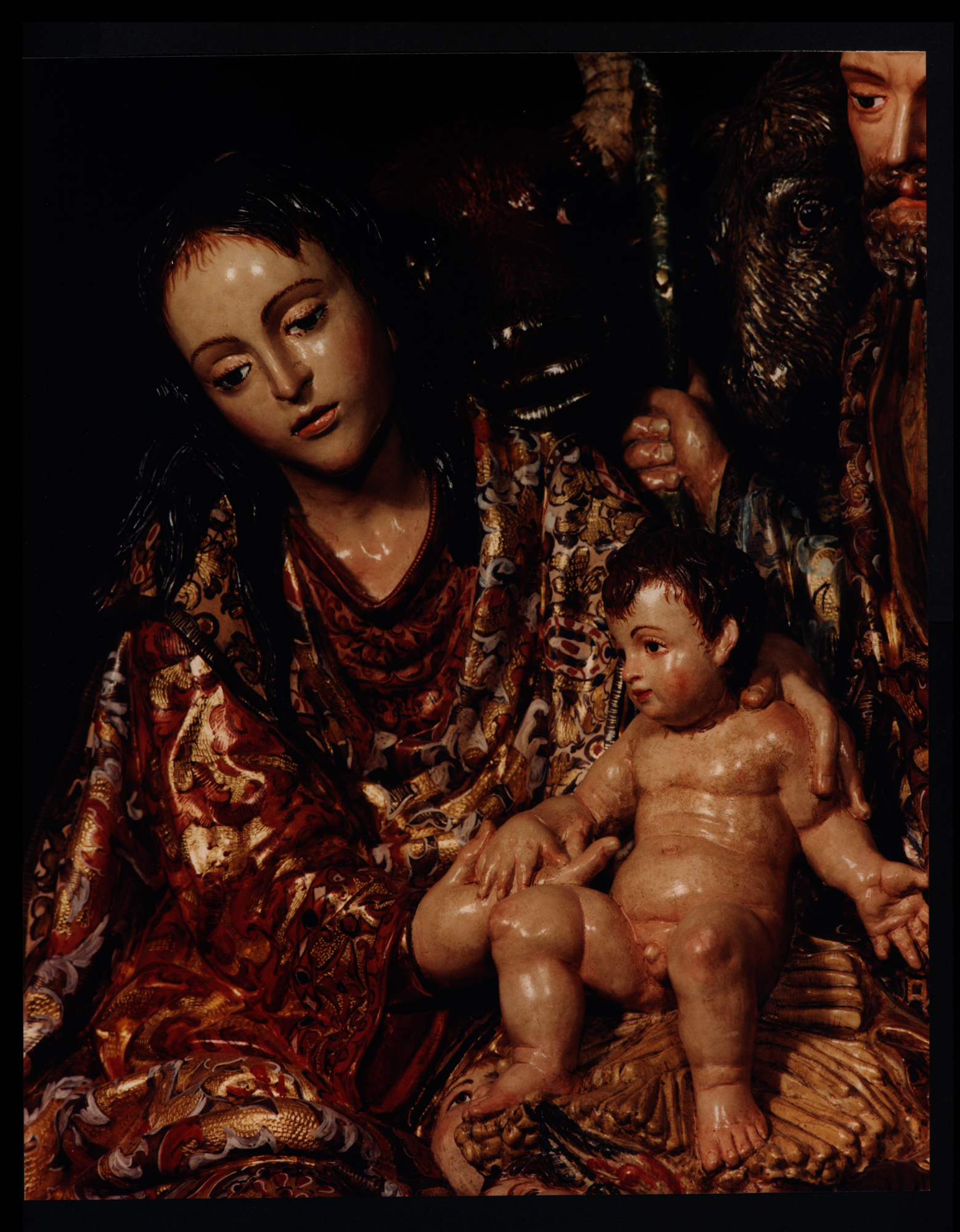 Título : Detalle de María, José, el niño Jesús, el buey y la mula, correspondiente al conjunto escultórico del "Nacimiento de Jesús" del Retablo de la Virgen del Rocío (Fotografía). Fondo Hermandad Matriz de Nuestra Señora del Rocío de Almonte