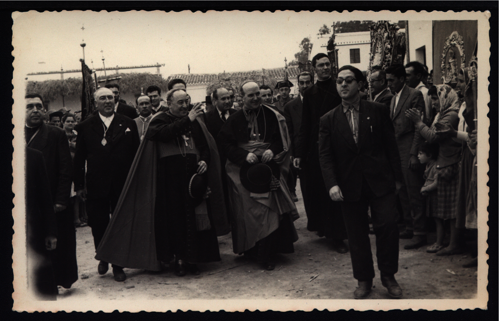 D. José María García de Lahiguera, obispo de Huelva, saludando a asistentes al acto de bendición del Santuario de Nuestra Señora del Rocío (Fotografía). Fondo Hermandad Matriz de Nuestra Señora del Rocío de Almonte