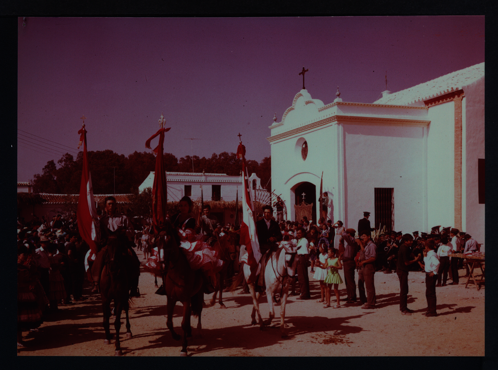 Denominación del Bien: Caballistas portando insignias de una Hermandad del Rocío en su presentación ante la Hermandad Matriz en la portada de la Capilla provisional en una Romería del periodo 1964-1968 (Fotografía). Fondo Hermandad Matriz de Nuestra Señora del Rocío de Almonte (282203)