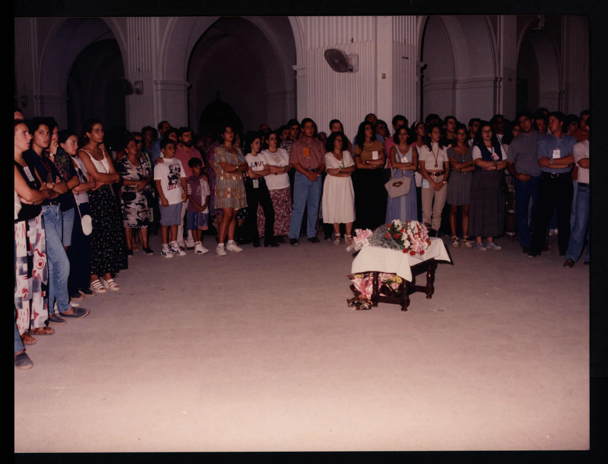 Reportaje de los jóvenes asistentes en el lado del Evangelio a la misa de clausura del VIII Encuentro de Jóvenes Rocieros celebrada en el Santuario en 1996 (Fotografías). Fondo Hermandad Matriz de Nuestra Señora del Rocío de Almonte