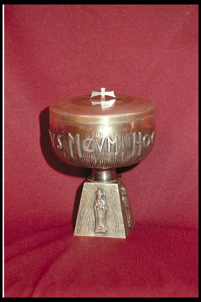 | Descripción : | Sagrario.-Anónimo madrileño.- Pie troncopiramidal con un relieve de evangelista en cada lado. Copa con inscripción. Tapadera lisa con cruz. |