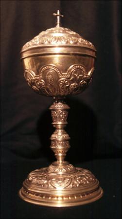 | Descripción : | Sacristía. Dependencias.-Anónimo andaluz.- Realizado en plata sobredorada, la base, de planta circular, está decoradacon el anagrama de Cristo, corazón de Jesús, cabeza de Cristo y los brazoscruzados. El astil, abalaustrado, se ornamenta con decoración vegetal dando paso a la copa que se decora con medios puntos con espigas y vides. El conjunto remata en una tapa con semejante decoración y coronada por una cruz. |